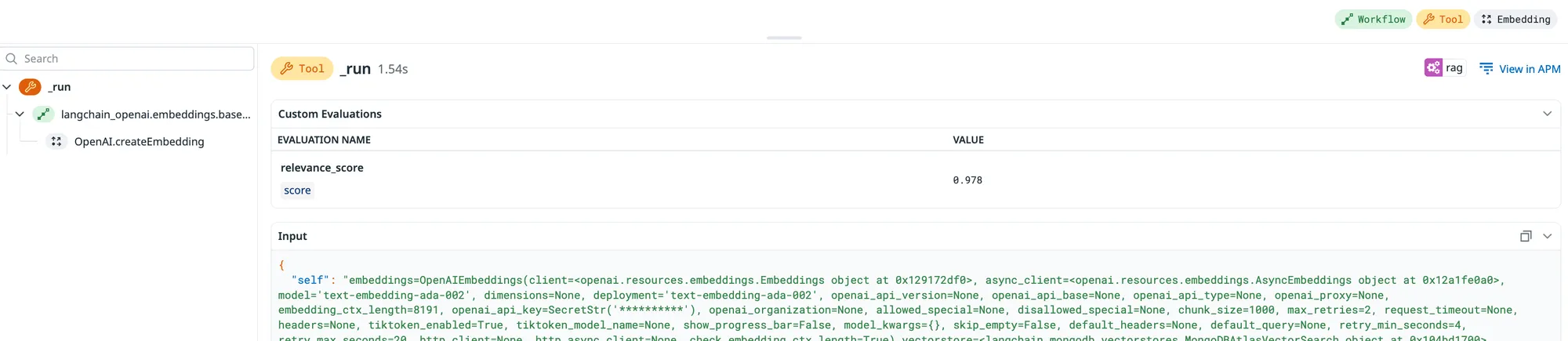 Additional LLM Trace Details with relevance_score visible