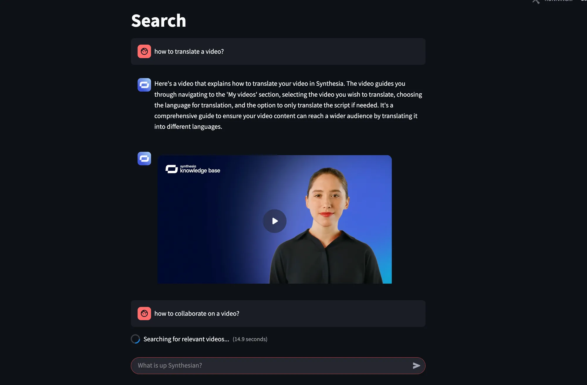 description: str = "Search for knowledge videos about Synthesia. Returns a list of videos with their rerankSearchScore. The link to the video is https://share.synthesia.io/<video_id>"