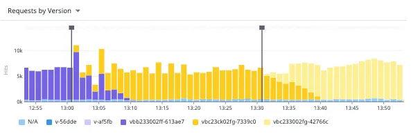 In the example below, we simply overlay on top of the number of agent running a bar when a new release is available. In other cases, it is often handy to overlay a app version change on top of latency and error rate graphs.
